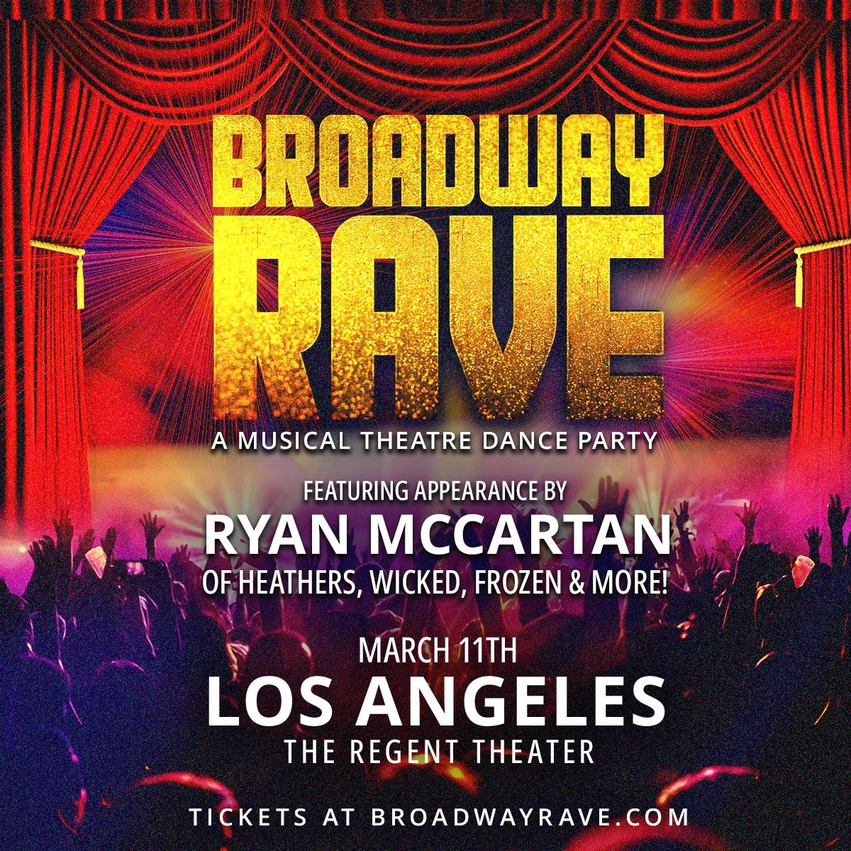 The concept was centered around bold, traditional red theater curtains framing a sparkling gold logo, with vibrant stage lights beaming from behind. To further engage our audience and resonate with the Broadway theme, I designed some of the social media assets to appear as though they were being displayed on Times Square billboards, where Broadway ads typically dominate. I aimed for the branding and designs to feel cinematic—almost like visuals that could grace a real Broadway Playbill or stand out on a billboard in Times Square among the multitude of other ads. These designs were crafted to capture the essence of Broadway and effectively convey the excitement of the events, fueling interest and driving ticket sales.